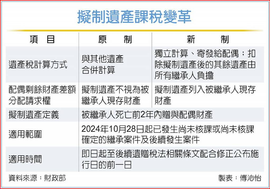 財政部表示,為落實憲法法庭113年憲判字第11號判決(下稱本判決)意旨,避免繼承人須以其繼承遺產繳納被繼承人死亡前2年內贈與配偶財產(下稱擬制遺產)之遺產稅,以及在遺產稅制中充分評價配偶因共同家計所生之經濟貢獻,