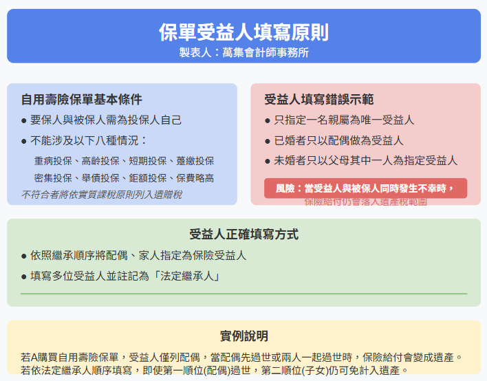 例如A購買自用的壽險保單,如果受益人僅列配偶,若配偶先過世或兩人一起過世,則保險給付就會變遺產範圍,若A依法定繼承人順序填寫多位受益人並註記,即使第一位法定繼承人(配偶)先過世,第二順位(子女)也能適用保險給付免計遺產規定。