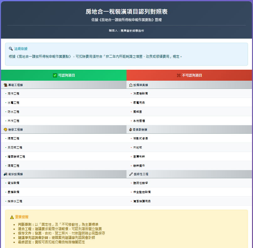 答:請參考以下說明,根據根據《房地合一課徵所得稅申報作業要點》,可扣抵的費用必須符合「非二年內所能耗竭之增置、改良或修繕費用」。而且必須是固定式、不可拆卸的才可以認列,跟一般民眾認知的裝潢費用,範圍會比較窄、認定比較嚴格、還需要取得統一發票,不能僅憑付款證明來認定裝潢費用的扣抵。