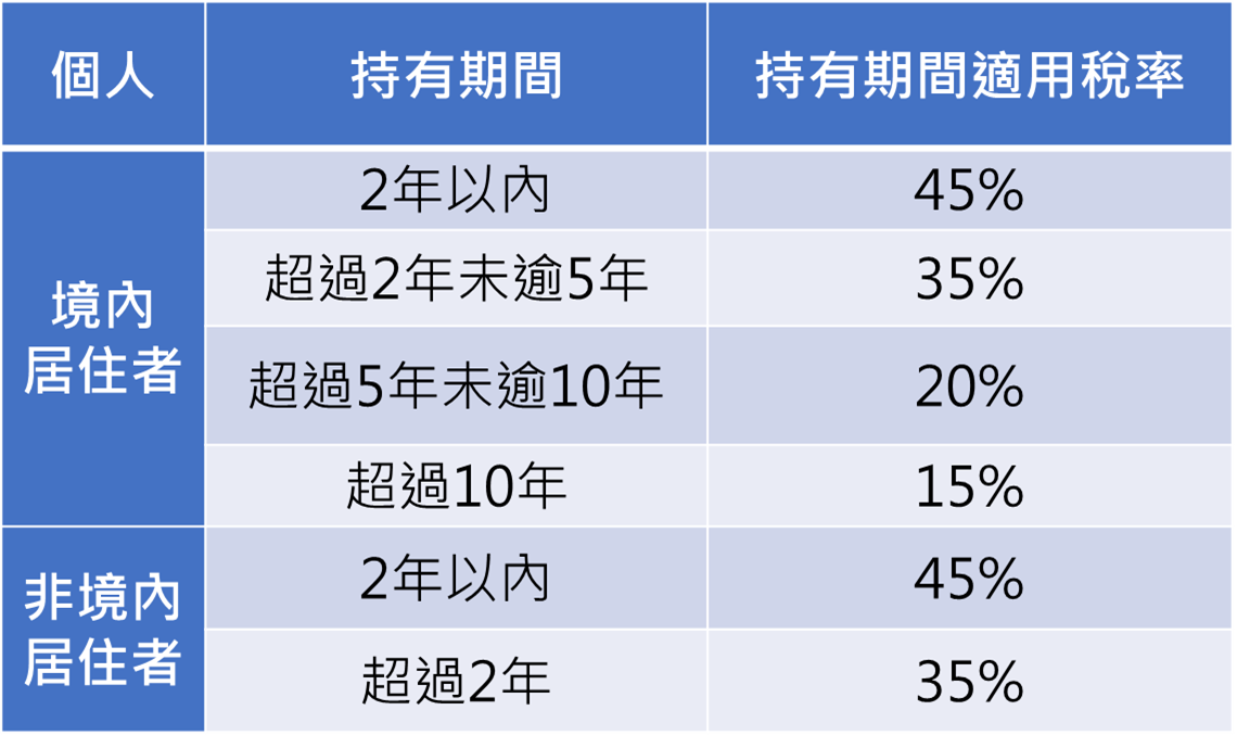- 持有房屋超過10年:稅率 15%