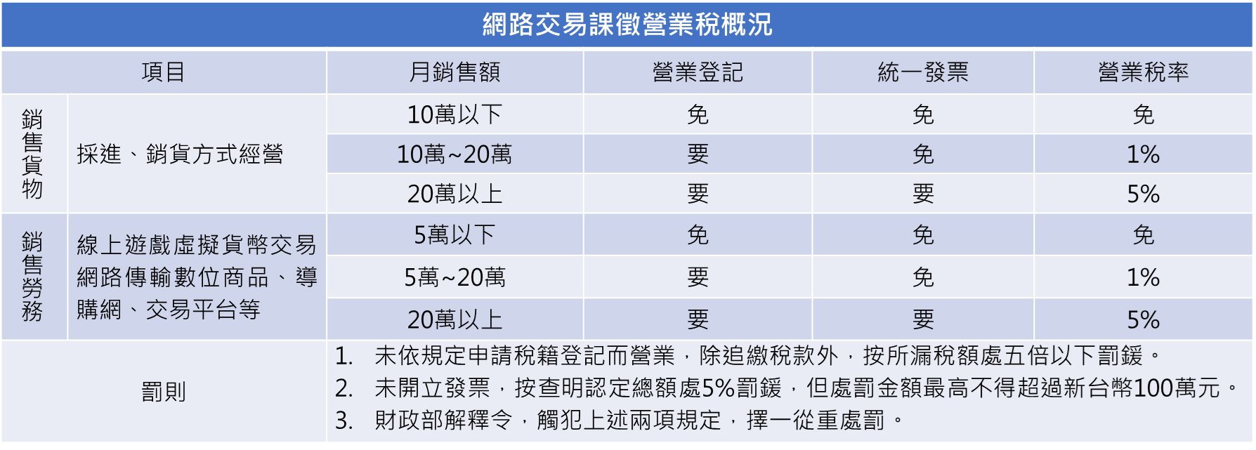當月銷售貨物或勞務達營業稅起徵點者 {銷售貨物為新臺幣(下同)10萬元,銷售勞務為5萬元},即必須向住(居)所或戶籍所在地所轄稽徵機關辦理稅籍登記並課徵營業稅。
