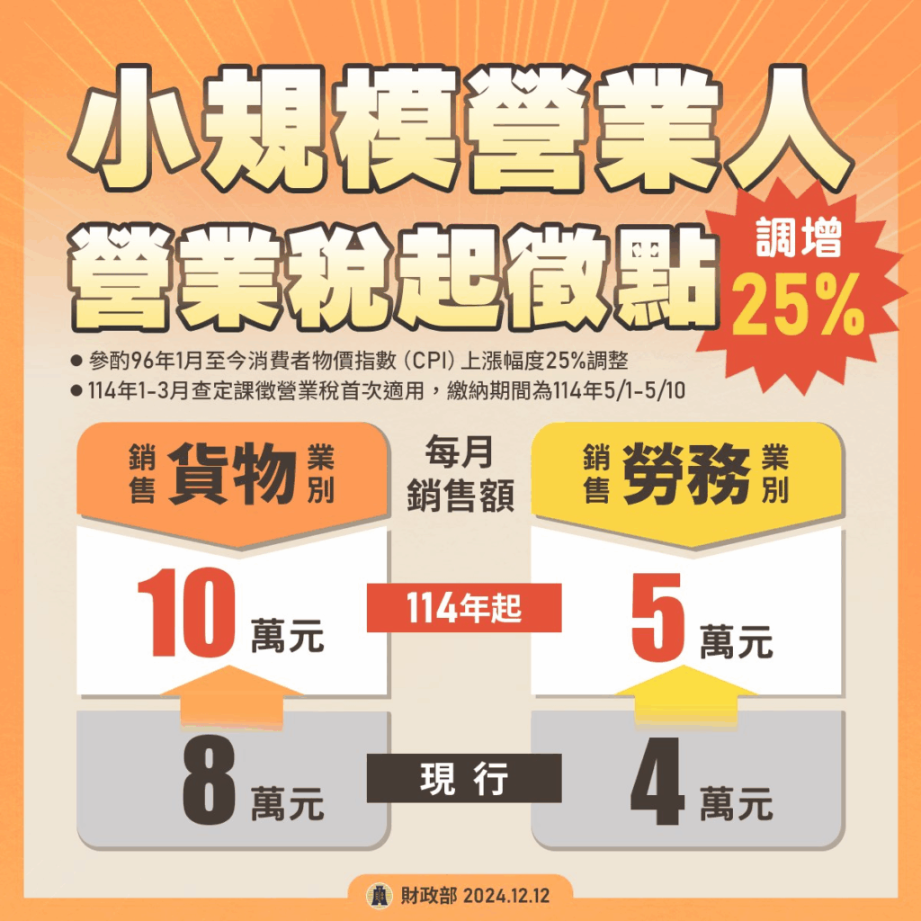 「小規模營業人營業稅起徵點」(下稱起徵點),自114年1月1日起,