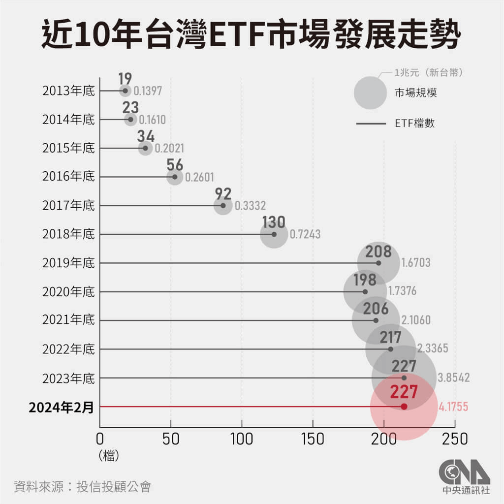 買ETF變全民運動。近年國內ETF快速成長,2018年底規模僅7446億元(國內股票型 ETF為1071億元),至2024年4月底已達4.78兆元(國內股票型ETF 為1.92兆元),整體 ETF規模於過去5年間成長逾5倍,其中,國內股票型ETF成長更高達1688%,遠超過台股同期間市值成長率120%。隨 ETF規模快速增長,占台股市值比重亦逐漸上升,2018年底國內股票型ETF規模僅占台股市值0.33%,至2024年4月底提高至2.71%。根據投信投顧公會統計,截至2024年6月底,台灣共有238檔證券投資信託ETF,市場規模達新臺幣5兆2,918億元,規模已為亞洲市場第三大。央行也指出,目前國內ETF在台股占比雖不高,但規模及投資者快速成長,未來對股市影響力將提高,應留意對台股可能產生「助漲助跌」的風險。國人投資ETF多著重高配息,卻忽略價格風險,央行提醒民眾勿一窩蜂盲從進出股市,以免蒙受虧損。
