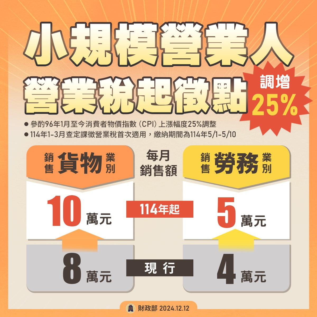 財政部今(12)日修正發布「小規模營業人營業稅起徵點」(下稱起徵點),自114年1月1日起,