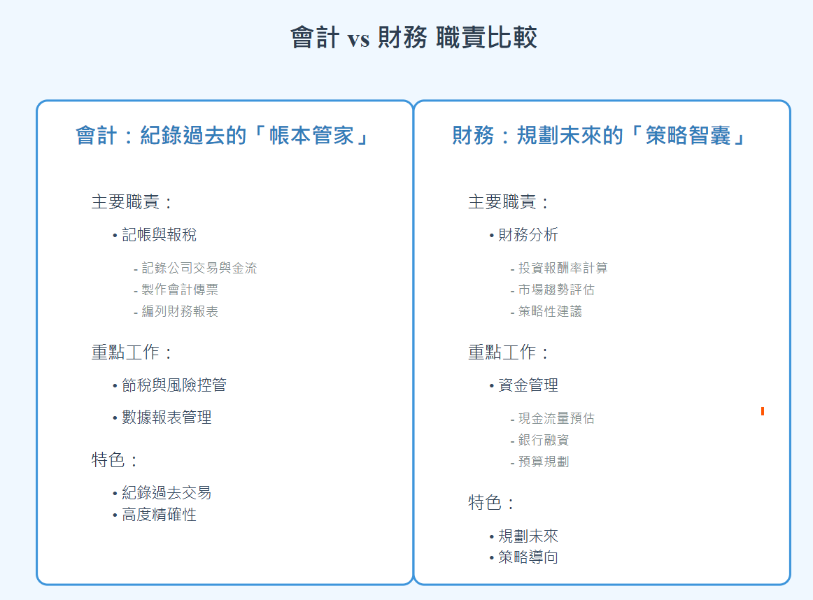 - 會計與財務的基本差異:會計偏向於記錄和報告過去的財務活動,而財務則著重於資金的規劃和管理
