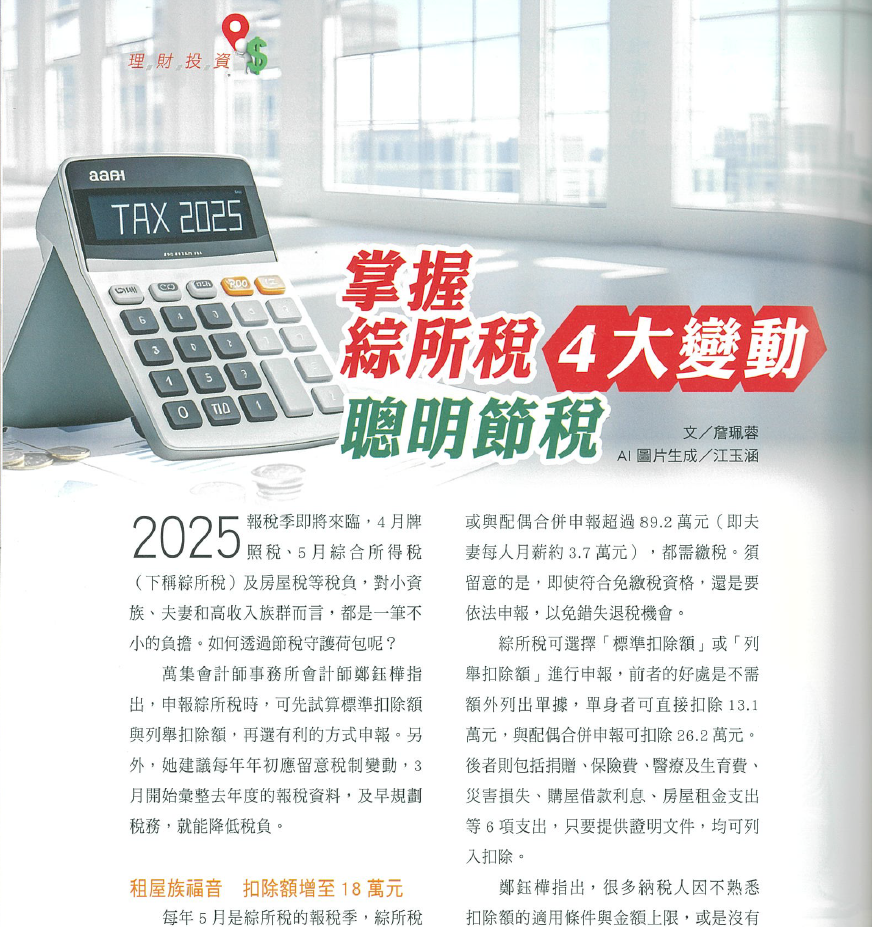 媒體報導 113年綜所稅變動 雜誌報導 2025-06-06 Posted by 萬集會計師事務所 2025 5 月 29日 禪天下241期/2025年04月 2025年5月報稅及來臨,掌握綜所稅4大變動,聰明節稅! 113年綜所稅節稅攻略,幫你守住荷包! 20250529193814下載