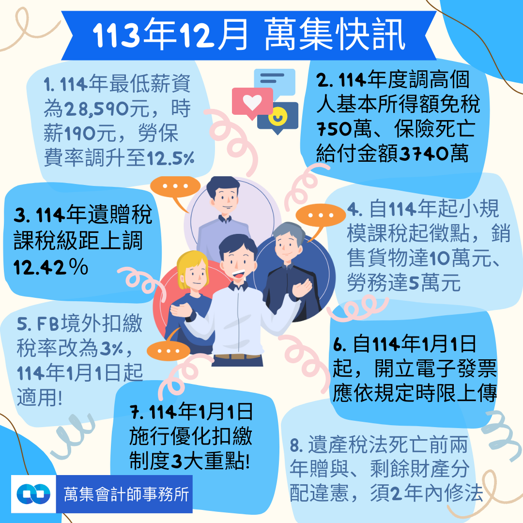 大家好,113年12月年末將近,新的稅務資訊跟大家分享,會計師要提醒您:
