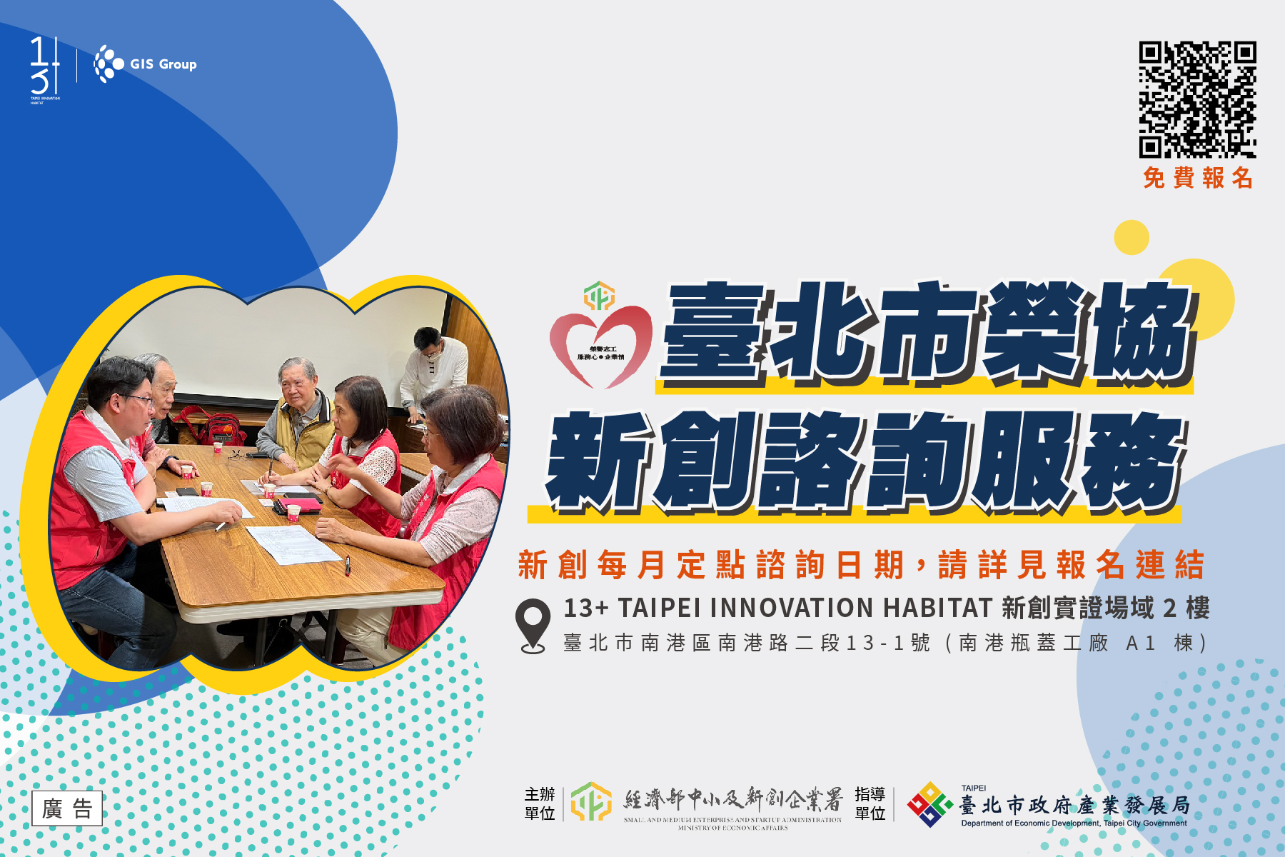 13+ 新創實證場域 與台北市中小企業榮譽指導員(企業服務志工)協進會合作 ,每月提供【免費諮詢服務】報名熱烈開跑啦!