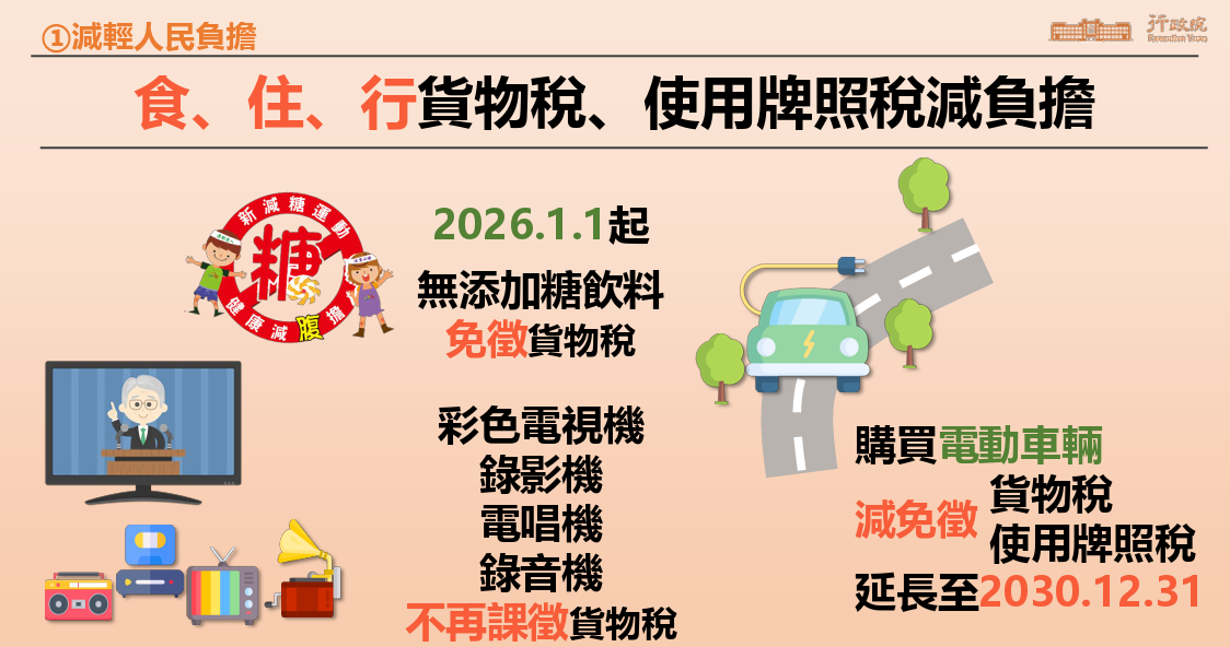 四、增訂飲料品無添加糖者免徵貨物稅及刪除部分電器類貨物課徵貨物稅規定,自115年1月1日施行: