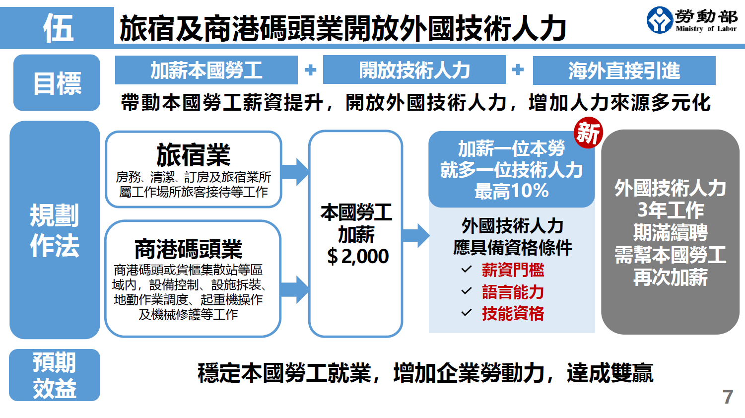 三、旅宿業及商港碼頭業引進外國技術人力:開放「旅宿服務工作」、「商港碼頭貨物裝卸集散工作」得聘僱外國技術人力且直接從海外引進,雇主為其聘僱全時本國籍工作者加薪,每加薪一位本國勞工就多一位外國技術人力名額,最高不得超過其勞保投保人數10%。