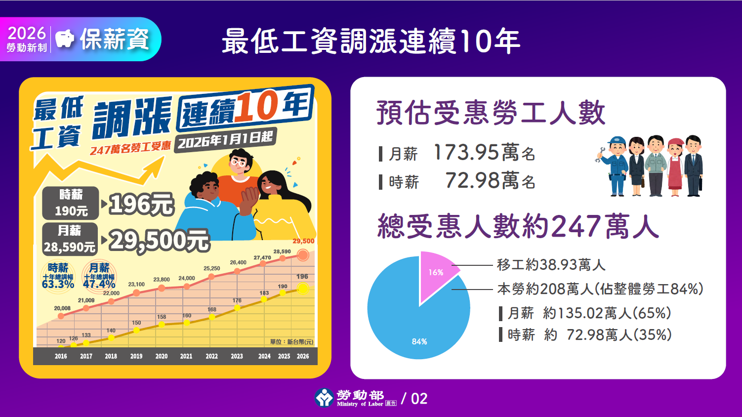 本次調升預估約247萬名勞工受惠,其中本國勞工約208萬人,占整體勞工84%。