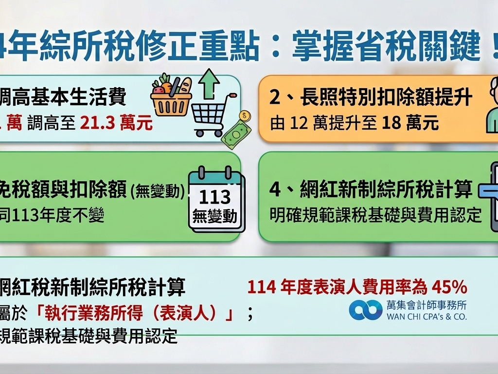 23 4 月 稅務法規, 保險費, 個人最低稅負制, 個人綜所稅, 其他所得, 列舉扣除額, 執行業務所得, 幼兒學前扣除額, 扶養親屬扣除額, 教育學費特別扣除額, 綜所稅免稅額, 薪資所得, 購屋貸款利息, 輕鬆節稅, 輕鬆節稅-綜所稅 輕鬆節稅-17:個人綜合所得稅常見問題QA Posted by 萬集會計師事務所 2025-12-10 https://www.youtube.com/watch?v=3owjGEso9-g Q: 綜合所得稅的計算方式是怎樣的? 綜所稅計算3步驟 A:根據所得稅法規定,綜所稅計算包含三個步驟: 1. 計算綜合所得淨額:所得淨額 = 所得... Continue reading
