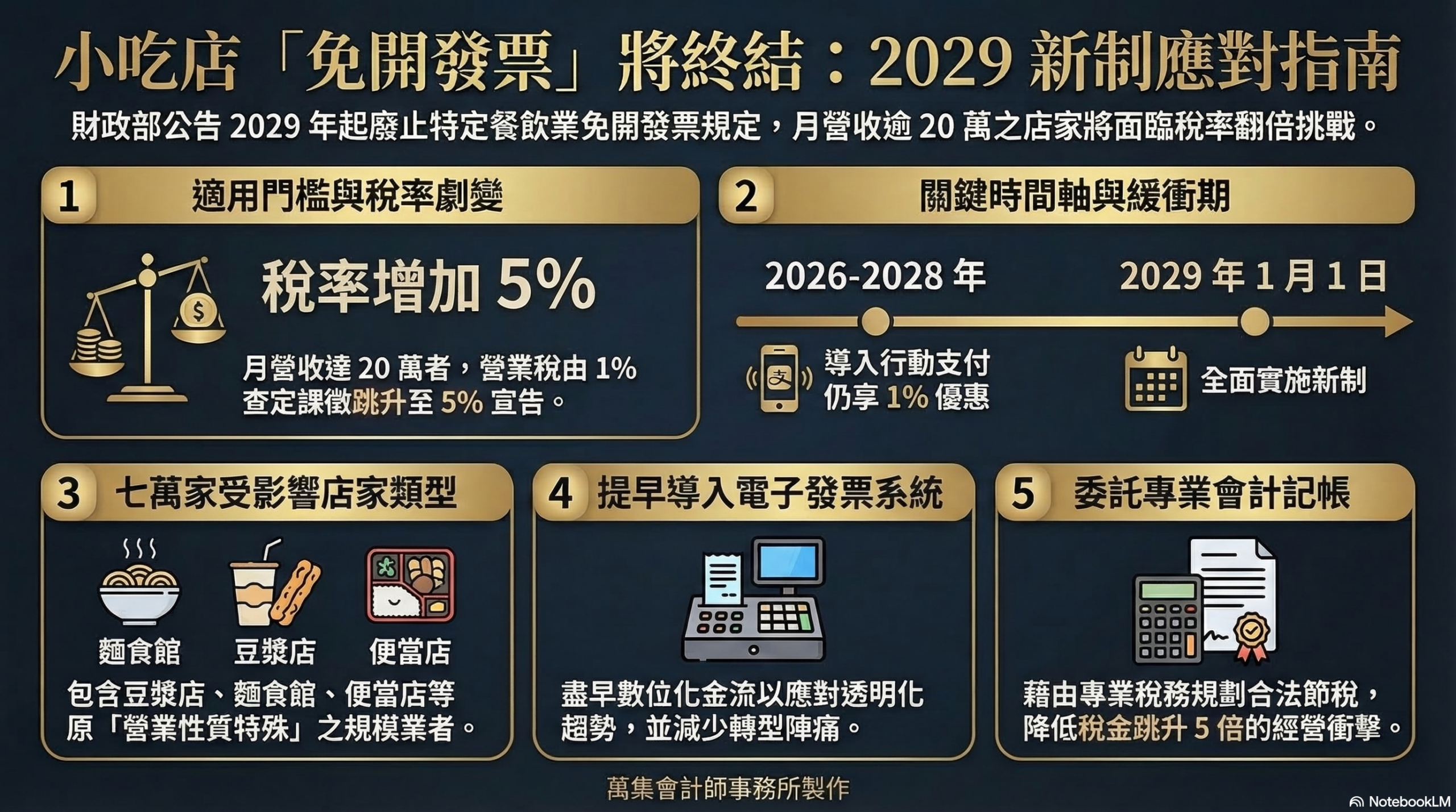 規定自118 年元旦起,月營收超過 20 萬 的大眾化餐飲業(如豆漿店、便當店等)必須開立統一發票。強調過往因技術門檻而給予的「免稅」已不合時宜...