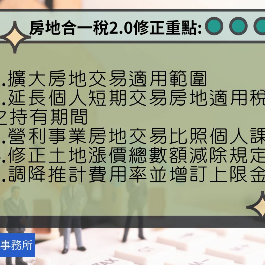28 10 月 稅務法規, 房地合一稅2.0, 所得稅, 營利所得 房地合一2.0重點整理—連續繼承可合計期間、獨資、合夥資本主,改由依個人房地合一稅2.0規定申報及課徵所得稅,不計入營利事業之所得額 (112年11月更新) (附影片說明) Posted by 萬集會計師事務所 2025-03-13 房地合一2.0版7月上路,為打擊炒房,政府大範圍圈住投資客也加重課稅,盤點財政部共祭出四大變革,包括短期套利者課稅加嚴、法人比照個人課稅、強化反避稅機制,並將預售屋、特定股權交易納入適用;另為配合房地合一稅2.0上路,於同年6月30日修正發布「房地合一課徵所得稅申報作業要點」,以利徵納雙方遵循。 其中,預售屋所得現行是併入隔年5月綜所稅報繳,稅率5%至40%。 2.0版將比照房地,於交易日次日起算30日內申報繳納,且出售有獲利幾乎就得課35%、45%重稅;財政部目前規劃以「契約日」判定預售屋交易日,若買賣合約在7月1日後才簽定則適用2.0版。 Continue reading