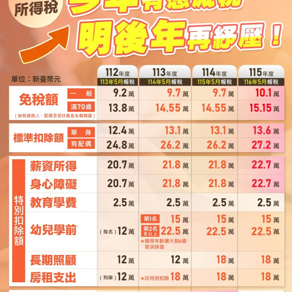 30 12 月 稅務法規, 個人綜所稅, 列舉扣除額, 幼兒學前扣除額, 扶養親屬扣除額, 教育學費特別扣除額, 標準扣除額, 綜所稅免稅額, 綜所稅身心障礙扣除額, 薪資所得特別扣除額, 輕鬆節稅-綜所稅, 退職所得 2026報稅「綜所稅」減稅了!免稅額10.1萬、單身標準扣除13.6萬、薪資扣除額22.7萬、稅率級距調整一次看;遺贈稅不變! Posted by 萬集會計師事務所 2025-12-30 115年綜所稅新制 行政院通過「115年度中央政府總預算案暨附屬單位預算及綜計表」,政府將自2026年起推出減稅措施,包含調高基本生活費、長照特別扣除額、幼兒特別扣除額,並將租屋支出改列特別扣除額,以及調高課稅級距金額等,以增加民眾家庭可支配所得。 stoc... Continue reading